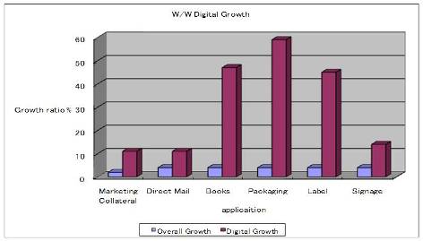 商業(yè)打印領域的焦點在高速寬幅數(shù)碼印刷機,全球只有少數(shù)幾家公司擁有此種技術,市場能見到的主要的機型有大日本網(wǎng)屏的TruepressJet520,日本宮腰的MJP系列,東京Kikai的Jetreader,惠普的Webpress T300,柯達的Prosper5000XL等,此類卷紙印刷機的主要應用在直郵、帳單、書報出版、促銷廣告等方面,以宮腰的MJP20F為例,在1200X1200DPI精度下,速度可達每分鐘250米,打印幅寬541毫米。