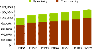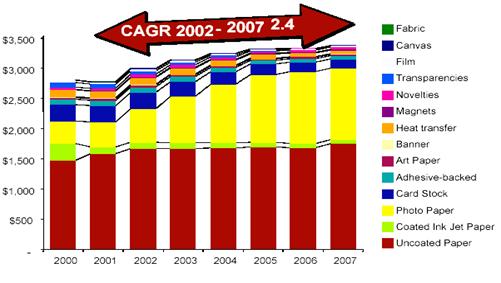 統(tǒng)計數(shù)據(jù)表明,美國家用電腦和打印機的普及培育了桌面噴墨打印的市場,2004年噴墨方式輸出的1160億張打印紙中,特殊打印介質(zhì)將近300億張,預(yù)期2002年至2007年間普通噴墨打印紙和特殊打印介質(zhì)均會有穩(wěn)定增長,這段時間內(nèi),噴墨打印介質(zhì)的打印數(shù)量年度遞增率(CAGR)為3.5%。2004年美國整個噴墨介質(zhì)的收入超過32億美元,其中普通產(chǎn)品約17億美元,透明片或其它膠片薄膜產(chǎn)品0.5219億美元,特殊打印介質(zhì)超過13億美元。雖然普通產(chǎn)品(commodity)仍是噴墨打印的主要輸出對象,數(shù)量上占了總噸數(shù)的75%,但由于價格低,其銷售額只占總銷售額的40%。 2005年預(yù)期桌面噴墨打印的總量將超過1202億張,市場份額33億美元。2002-2007年間預(yù)期噴墨打印紙的銷售額年遞增率2.4%。特殊打印介質(zhì)包括彩噴紙(Coated paper),照片打印紙(Photo paper),明信片紙,背膠,油畫紙,標(biāo)簽紙等等。在特殊打印介質(zhì)的增長中,彩噴紙的增長速度相比較慢,而照片打印紙增長速度很快,預(yù)計2002-2007年間照片打印紙的年遞增率將高達(dá)16%!這種增長歸功于低價位數(shù)碼相機的熱銷;低于50美元打印機的銷售;和數(shù)字圖像傳輸?shù)目旖菪浴?/span>