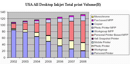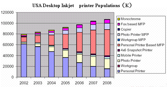 2004年11月15日InfoTrends研究機構(gòu)發(fā)表的市場調(diào)查結(jié)果表明,2003年美國共安裝了超過8300萬臺桌面噴墨打印設(shè)備,使得噴墨成為桌面打印的主要輸出方式。其中,照片噴墨打印機裝機量482萬臺,比02年增加39%。在這里所謂照片打印機(Photo Printer),是指同時具備照片級彩色輸出性能,數(shù)碼相機存儲卡插槽,照片級墨盒三種典型特征的打印機。多功能一體機(MFP, multifunctional printers or imaging devices)是將打印,掃描,傳真,復(fù)印等功能復(fù)合一體的設(shè)備,其增長的速度也非??欤?003年裝機量1585萬臺,比02年的1085萬臺增長46%。其中部分MFP除打印,掃描,傳真功能外,還具備照片彩色打印功能,這種增長同時也大大提高了特殊打印介質(zhì)(specialty media)的需求。Infotrends預(yù)期到08年,照片噴墨打印機的年裝機量可達(dá)1890萬臺,占總裝機量的18%,普通MFP高達(dá)4800萬臺,占總裝機量的45%,帶照片彩色打印功能的MFP1160萬臺,占總裝機量的11%。而普通型個人噴墨打印機(Personal Pinter)的裝機量呈逐年下降趨勢,數(shù)據(jù)表明2003年比02年下降了4.3%,普通個人噴墨打印機所占比例也逐年減少,預(yù)期08年僅占15%以下。2003-2008年間,噴墨打印機的總裝機量CAGR 為5%。