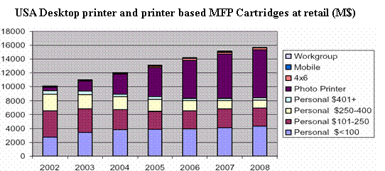 從全美零售市場的數(shù)據(jù)分析, 2003-2008年噴墨墨盒的零售總額年遞增率約8%,其中照片質(zhì)量墨盒的銷售量呈增長勢頭強勁。由于照片噴墨打印機和具備照片彩色打印的MFP可能使用同一型號墨盒,統(tǒng)計將兩者合并。普通噴墨MFP也和對應(yīng)的普通個人型打印機合并。數(shù)據(jù)顯示,2003年用于照片打印的墨盒零售總額19.10億美元,占全年零售總額(107.2億美元)的17.8%, 比02年的6.90億美元增加了177%。2008年, 預(yù)期用于照片打印的墨盒零售總額可達(dá)73.10億美元。對于普通的中高端墨盒零售額,由于受到價格下降和激光打印輸出方式的影響,03年到05年間有明顯下降,05年至08年基本保持不變。而低端的噴墨墨盒一直穩(wěn)中有升。