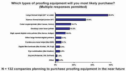 2004年1月市場研究公司InfoTrends發(fā)表的CAP ventures和“Digital Output Magazine” 聯(lián)合開展的公司用戶調(diào)查結(jié)果,回答近期內(nèi)公司準(zhǔn)備采購何種數(shù)碼打印設(shè)備時,56.8%的公司準(zhǔn)備采購超過24英寸的寬幅噴墨打印機,32.6%的公司準(zhǔn)備采購桌面噴墨打印機,桌面彩色激光打印機的采購傾向用戶15.2%, 可見噴墨在該領(lǐng)域占主導(dǎo)地位,這種狀況在一定時間內(nèi)延續(xù)下去。