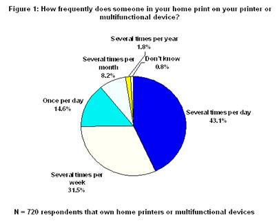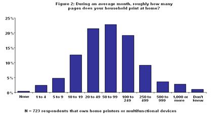 2003年8月CAP Ventures 通過對全美網(wǎng)上擁有家庭打印機的用戶進(jìn)行打印習(xí)慣調(diào)查,共有超過700名用戶參與調(diào)查并做有效回答,用戶使用打印機的頻率和打印張數(shù)下圖所示: