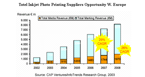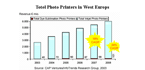 Infotrends /CAP Ventures 2004年2月的調(diào)查顯示, 2003年整個西歐照片噴墨打印機的市場銷售額為26.33億歐元,而熱升華打印機的銷售額僅0.40億歐元,2008年照片噴墨打印機的市場銷售額可望達(dá)到59.10億歐元,每年遞增率18%,熱升華1.01億歐元,由于基數(shù)小每年遞增率達(dá)34%。