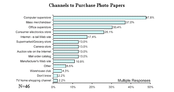 調(diào)查機構(gòu)發(fā)現(xiàn):用戶購買照片墨水和介質(zhì)的渠道有較大區(qū)別,雖然電腦超市都是用戶最常去的場所,但墨水的銷售很多是通過Internet和大型超市實現(xiàn)的,而介質(zhì)通過Internet網(wǎng)的銷售方式僅排第5位,大量用戶選擇在大型超市、辦公品商場購買。用戶選擇在辦公品商場購買墨水的比例僅占9.3%。上述區(qū)別的原因可能是:用戶對墨水品質(zhì)保證的關(guān)注程度高于介質(zhì),顯而易見相比于介質(zhì),墨水對打印機可能能造成更大的傷害。