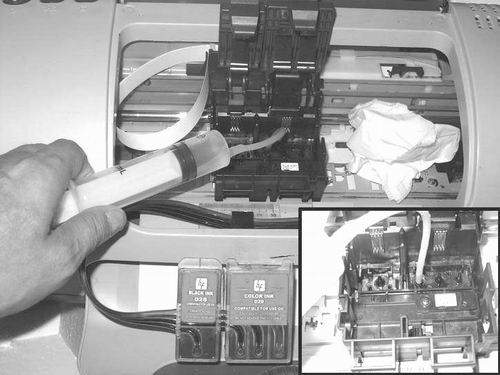 ②拔下軟管,將注射器和軟管清洗干凈,抽取清洗液或者純凈水后再次將軟管插入墨車上噴頭的吸墨柱,輕輕壓入2毫升水,水從墨車下流出,即刻用紙巾將水吸干(圖15)。如果感覺(jué)壓入的力量很輕,說(shuō)明噴頭已通,如果感覺(jué)費(fèi)力,再次輕輕壓入2毫升。最后,可以抽取1毫升相同顏色墨水壓入噴頭。