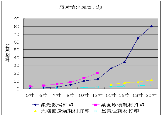 從上圖就可以看出,照片打印機(jī)和基于照片打印的多功能打印機(jī),每年都以30%以上的速度增長(zhǎng),僅美國(guó)市場(chǎng),2005年預(yù)計(jì)裝機(jī)量就達(dá)到2000萬(wàn)臺(tái)以上,2008年可達(dá)3000多萬(wàn)臺(tái)。 相比于數(shù)碼激光,照片的噴墨打印輸出至少有如下優(yōu)勢(shì):方便、隨意性強(qiáng):因?yàn)橥耆诩彝?、辦公室實(shí)現(xiàn),可大可小、可多可少,隨時(shí)隨地、隨心所欲。私密性好:用不著將數(shù)碼文件交給別人,也用不著從他人處取回,不想讓人見(jiàn)的,別人永遠(yuǎn)見(jiàn)不到。DIY,樂(lè)趣無(wú)窮:不管是對(duì)于專業(yè)人士,還是對(duì)于數(shù)碼發(fā)燒友,完全可以陶醉于從拍照、編輯修改到打印輸出的無(wú)窮樂(lè)趣。環(huán)保:不再用銀鹽等稀缺資源,也擺脫了藥水使用與排放對(duì)于環(huán)境的污染。持久不退色:噴墨打印墨水分為染料和顏料兩大類(lèi),如果使用顏料墨水打印出的照片,比傳統(tǒng)的銀鹽感光照片能夠保存更長(zhǎng)的時(shí)間而不退色。 噴墨打印技術(shù)不斷發(fā)展,墨水和打印介質(zhì)品質(zhì)也在不斷提高,從技術(shù)的角度來(lái)看,水性顏料墨水+RC間隙型防水高光相紙是照片噴墨的主流方向。不但質(zhì)感、影像品質(zhì)方面毫不遜色于銀鹽感光照片,而且在光線耐牢度、方便性、設(shè)備投入等方面明顯優(yōu)于感光照片。 可能唯一的問(wèn)題是成本,有的人會(huì)抱怨,噴墨打印的成本高,是的,以EPSON照片級(jí)噴墨打印機(jī),打印在原裝EPSON高質(zhì)量光澤照片紙上為例,打印一張6寸的照片,成本會(huì)在3元以上,而在外面的沖印店里,激光數(shù)碼沖印的報(bào)價(jià)只有一塊左右。定位于專業(yè)應(yīng)用的大幅面打印機(jī)打?。?4英寸到44英寸寬)成本會(huì)低很多,因?yàn)樽烂娲蛴C(jī)墨盒中的墨水,平均每毫升價(jià)值10塊人民幣左右,大幅面打印機(jī)墨盒的容量更大,平均每毫升2元上下。從下圖就可以看出,用專業(yè)大幅面打印機(jī)打印照片,成本就已經(jīng)遠(yuǎn)遠(yuǎn)低于激光數(shù)碼沖印的價(jià)格,但是這些打印機(jī)并不是給家庭使用的,像激光數(shù)碼沖印一樣,是給專業(yè)的影像服務(wù)機(jī)構(gòu)使用的。